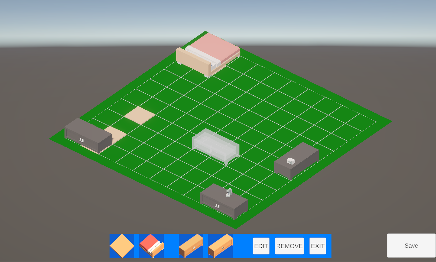 Features: grid snapping, cinemachine, object rotation, removal system, save/load system.